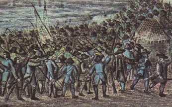 Bild: Ausschnitt aus: Peter Ellmer: Die Oberländischen Bauern erstürmen die Isarbrücke und den Roten Turm in der Christnacht 1705, Kolerierte Litographie, 1. Hälfte 19. Jahrhundert , Public domain, via Wikimedia Commons